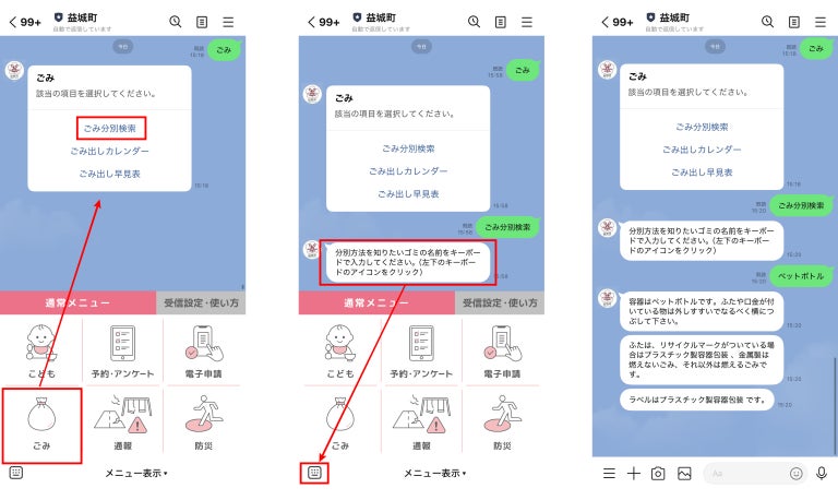 「ごみ」では、「ごみの一問一答機能」を搭載しております。LINEのトーク画面に直接「ペットボトル」「食品トレイ」などの破棄したいごみの具体名を入力することで、分別方法や捨てる際のコツを自動返答します。