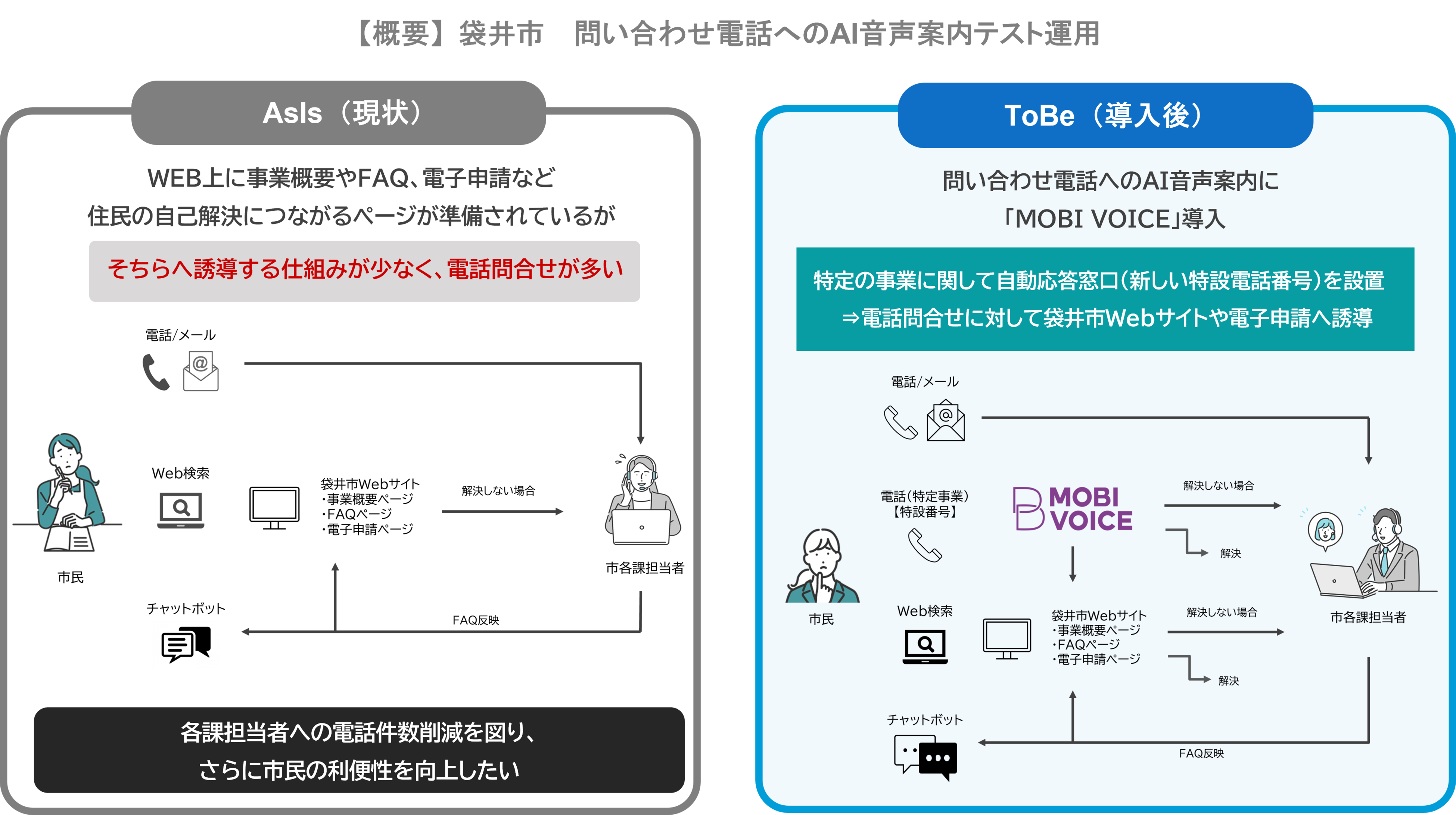 The SupportTech Companyとして顧客サポート支援のソリューションを開発・提供するモビルス株式会社(本社:東京都港区、代表取締役社長:石井智宏)は、袋井市が2022年12月1日から開始した新機能『チャットボット機能による「問い合わせ電話へのAI音声案内テスト運用トライアル」』にMOBI VOICEを活用した「問い合わせ電話へのAI音声案内」を提供したことをお知らせします。