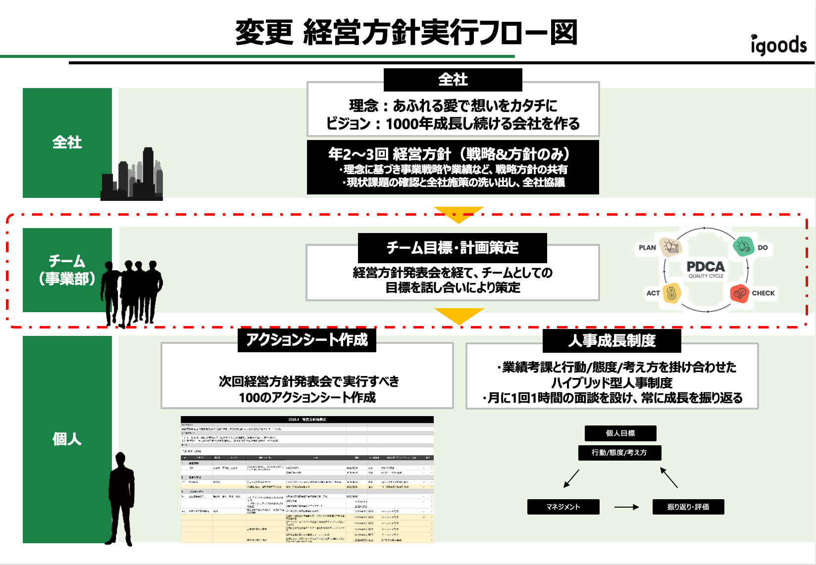 当社では、理念から一貫した経営を実現し、一人ひとりが、日々目的を見失わずに仕事を実行するために、経営方針発表会を年に2〜3回開催しています。経営方針発表会では、代表直々に全社戦略や事業別施策の方向性の共有、理念・ビジョンの振り返りが行われ、その後、これらの発表を踏まえて事業部ごとに次の半年間で実施すべき具体的な目標と期限、担当者を決定します。さらに、目標は「アクションシート」としてtodoリストにブレイクダウンされ、月1回1時間行われる上司との「人事成長面談」で進捗の振り返りを実施します。