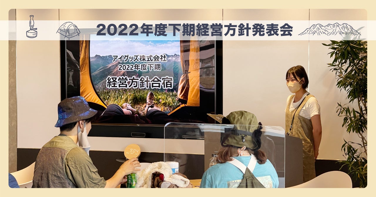オリジナルグッズを製作するアイグッズ株式会社(本社:東京都渋谷区)は、2022年9月に「2022年度下期経営方針発表会」を開催しました。年に2〜3回実施している方針発表ですが、今回は「キャンプ」というコンセプトのもと社内にテントを張り装飾を施し、社員もキャンプの服装で出社するなど、1日限定で社内がキャンプ場と化しました。また、「対話」をテーマに事業部ごとにチームの未来戦略を考え、経営陣にプレゼンするミッションも実施。全員が当事者意識を持って会社のあり方を再確認する1日となりました。