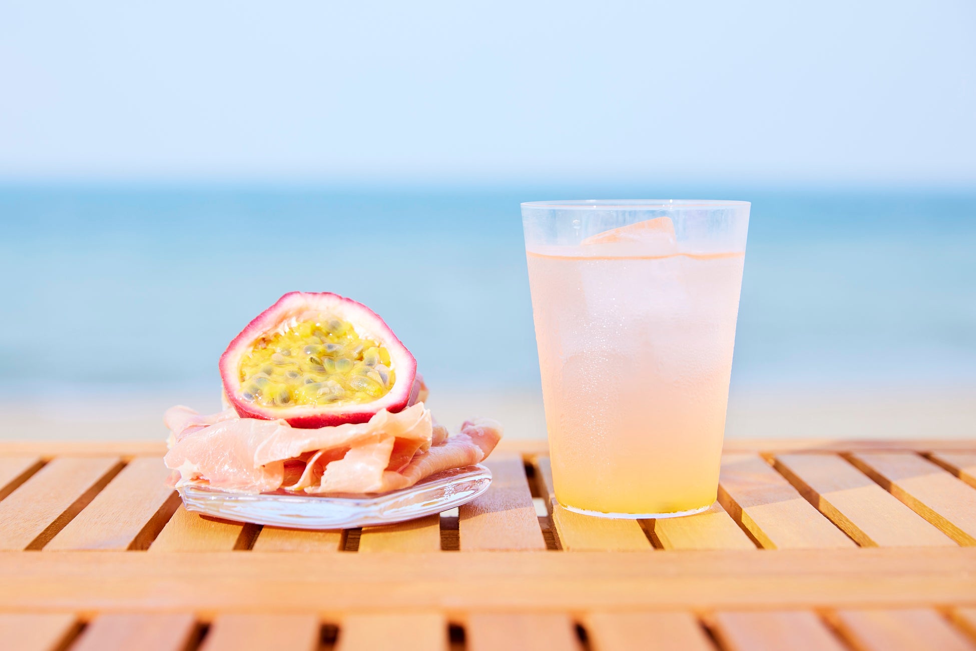 一連のサウナ体験を終えたら、爽やかな味わいの旬の素材を活かした、パッションフルーツの丸ごとサラダやモクテルを堪能します。パッションフルーツが有する朗らかな酸味と程よい生ハムの塩加減が出会うサラダは、汗をかいた後に嬉しい一品です。またパッションフルーツの果汁やシロップがベースのモクテルは、ローズの香りが漂う割材と合わせることで、春らしい華やかさを演出。南国らしいサウナ体験を締めくくる、甘酸っぱくさっぱりとした食体験です。