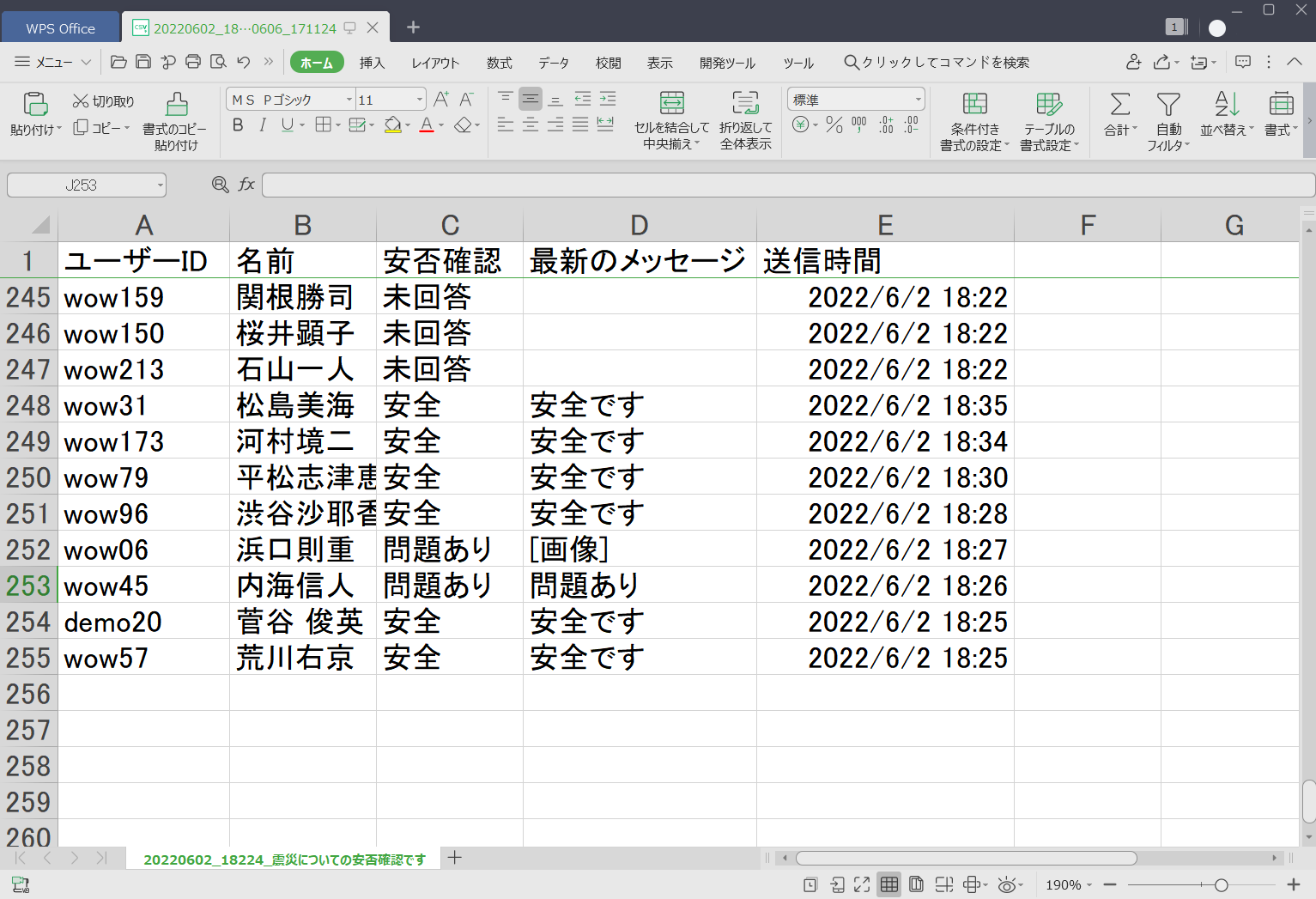 エクスポートしたデータは、エクセルなどの表計算ソフトやその他のシステムに転記することが可能です。自社のシステムやBCP対策の運用状況に合わせて、安否確認のデータを記録および管理いただけるようになります。