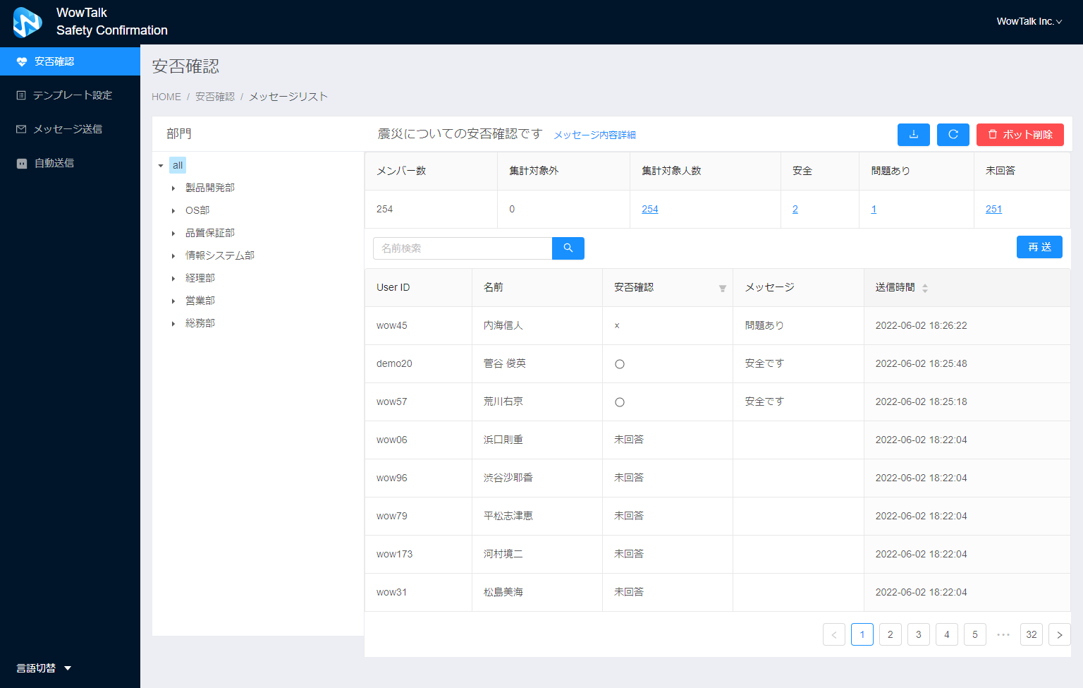 利用社数10,000社超と多くのビジネスパーソンにご利用いただいているサービス、ビジネスチャット・社内SNS「WowTalk(ワウトーク)」を開発・提供するワウテック株式会社(本社:東京都港区、代表取締役社長:瀬沼 悠、以下「ワウテック」)は、WowTalkの安否確認において、「集計結果のエクスポート機能」を追加したことをお知らせします。