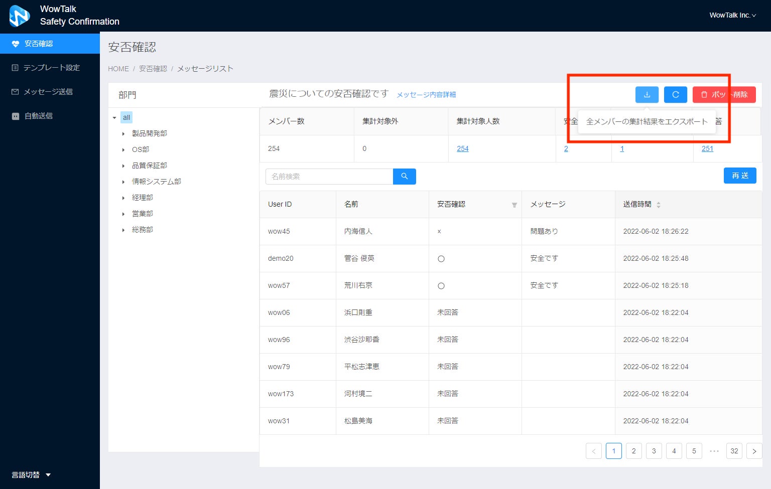 WowTalkの管理機能の利便性向上を目的として、安否確認の機能において、集計結果のエクスポート機能を追加しました。今回のアップデートにより、安否確認の管理者画面から、全メンバーの安否確認の集計結果を、CSVのデータ形式にてエクスポートいただけるようになります。