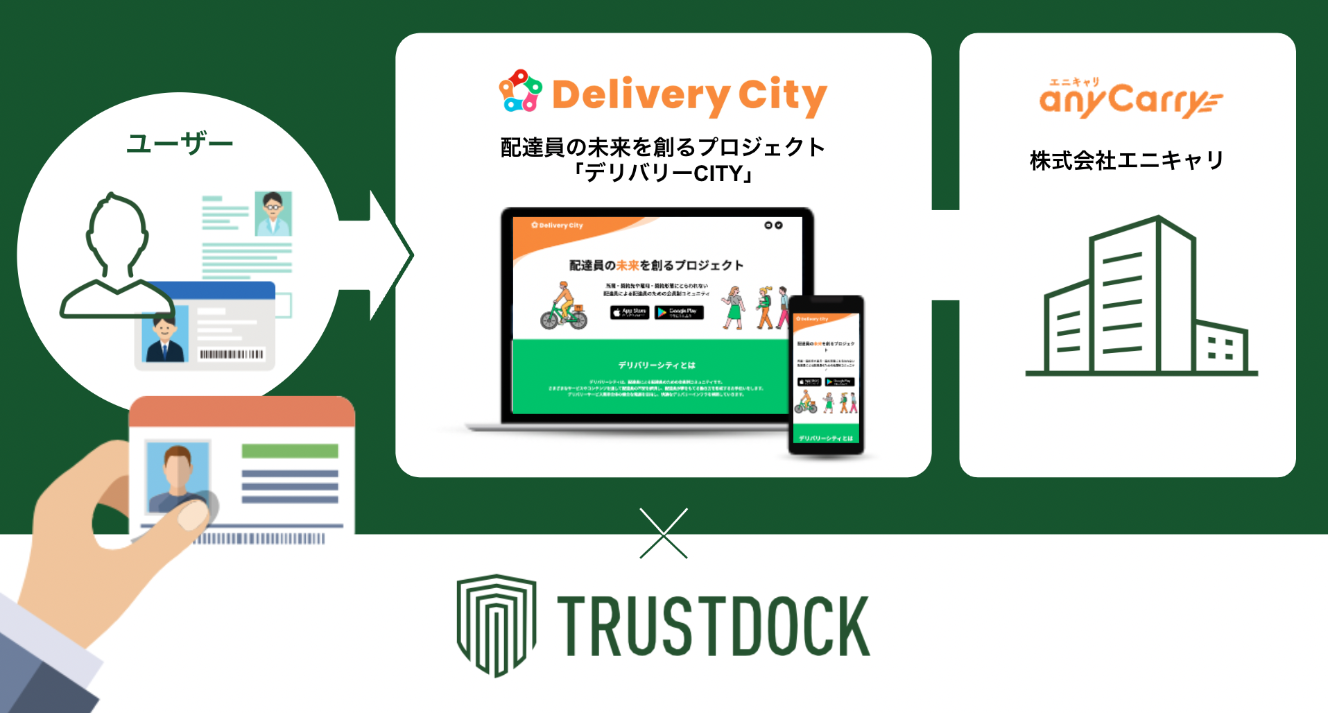 導入社数No.1(※)のオンライン本人確認/eKYCを提供する株式会社TRUSTDOCK(本社:東京都千代田区、代表取締役:千葉 孝浩、以下 TRUSTDOCK)と株式会社エニキャリ(本社:東京都千代田区、代表取締役:小嵜 秀信、以下 エニキャリ)は、本人確認業務の代行において業務提携することに合意し、エニキャリが展開する、配達員の未来を創るプロジェクト「デリバリーCITY」に、本人確認APIの導入実施を完了したことをご報告します。