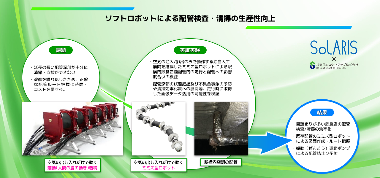 空気の出し入れのみで動作する人工筋肉を搭載したミミズ型ロボットを利用し、駅構内施設などのファイバースコープなどでは見ることの出来なかった配管深部の状態把握や不具合事象の予防、清掃効率化の可能性を検証する。