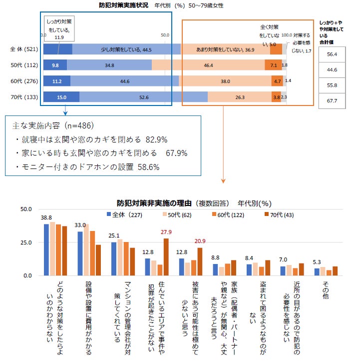 そのほか非実施の理由として、「住んでいるエリアで事件や犯罪が起きたことがない」「被害にあう可能性は極めて少ないと思う」といった楽観理由もそれぞれ1割を超え、年代別では70代で多い。