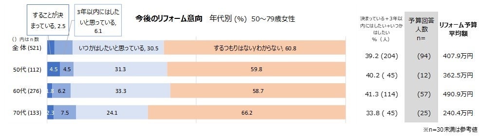 年代別にみると、リフォーム意向率、意向者における予算平均額ともに60代が最も高い。住居設備の老朽化に加え、自身の高齢化による生活の不便さも解消できるリフォームを望んでいる。(*予算平均額に関しては、50代および70代はn数が少ないため参考値)