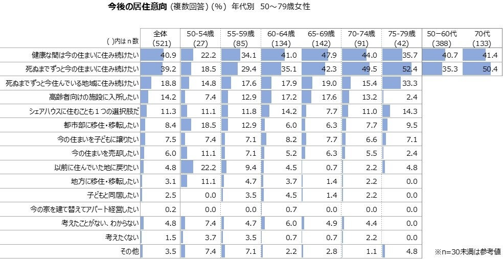 年代別にみると、「健康な間は今の住まいに住み続けたい」は、50代前半~60代後半へと年代があがるにつれて増える。「死ぬまでずっと今の住まいに住み続けたい」は年代が高いほど多くなり、70代では5割を超える。