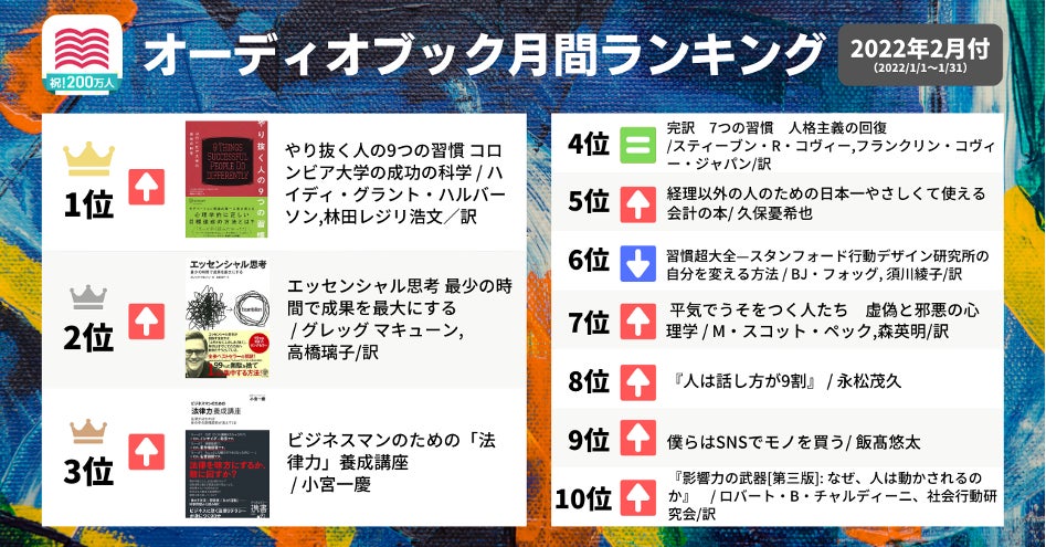 株式会社オトバンク( 本社:東京都文京区、代表取締役社長:久保田裕也、以下「オトバンク」)は、日本一のオーディオブック書籍ラインナップ数を配信する音声配信サービス「audiobook.jp」におけるオーディオブック月間ランキング2月付(2022/1/1~1/31)を発表します。