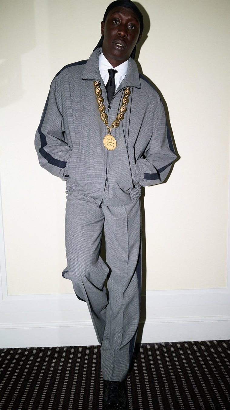 一方、カビー・ラメは、レッドカーペットでのダンディな装いから一転、よりカジュアルで彼らしい遊び心あふれるスタイルを披露しました。ヒップホップグループ「Run-D.M.C.」へのオマージュとしてデザインされたBOSSのカスタムルックは、サイドストライプ付きの千鳥格子ウールトラックスーツジャケットにクラブカラーの白シャツをレイヤード。トラウザーズはドローストリング付きのウエストが特徴で、リラックス感のある仕立てとなっています。仕上げには、BOSSジュエリーのゴールドトーンのチェーンとペンダント、クロコ型押しのブラックレザースニーカー、そしてブラックタイを合わせ、個性と品格を兼ね備えたアフタースタイルを完成させました。