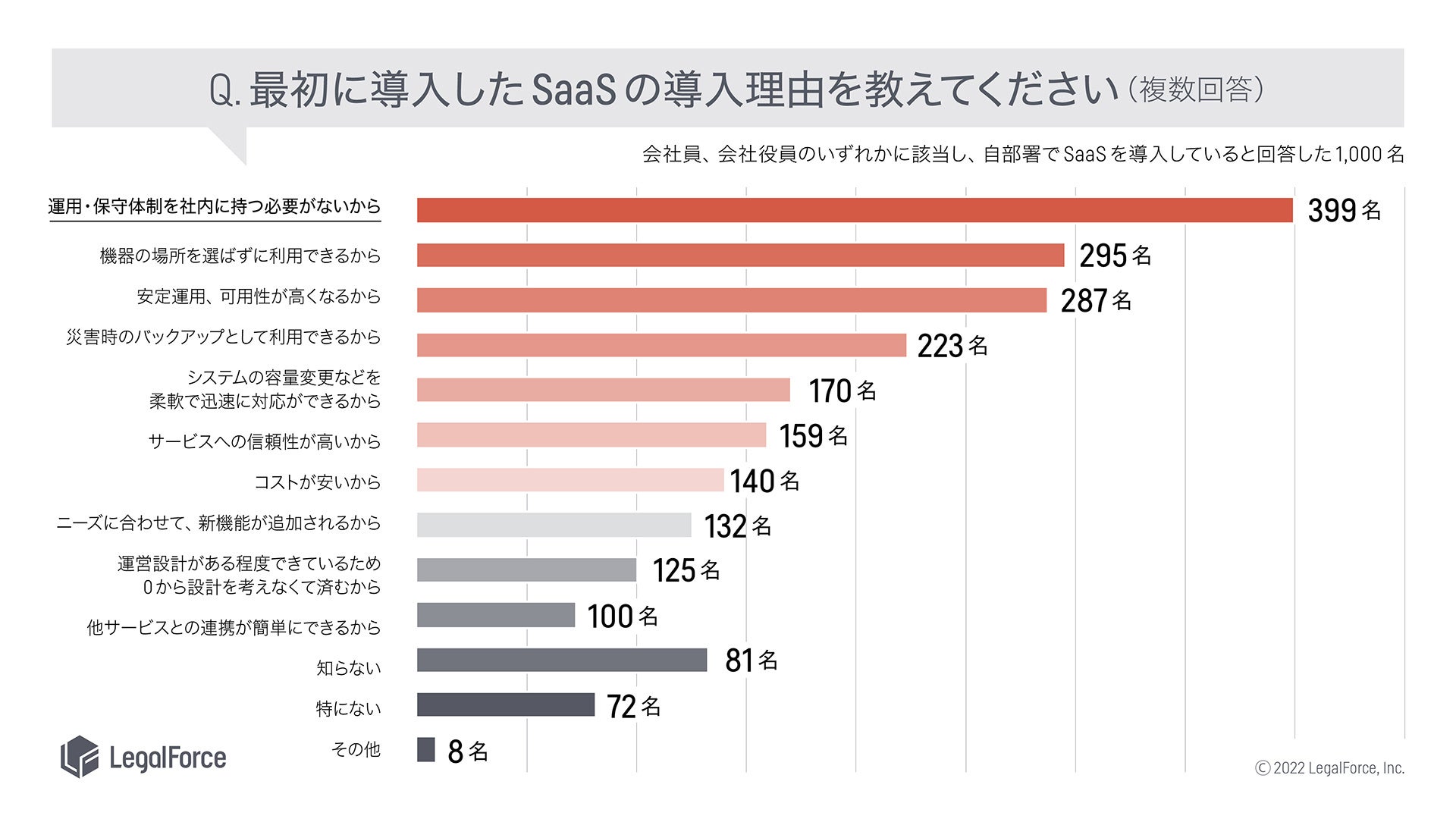 ・SaaS導入理由について、回答者の約4割(399名)が「運用・保守体制を社内に持つ必要がないから」と回答