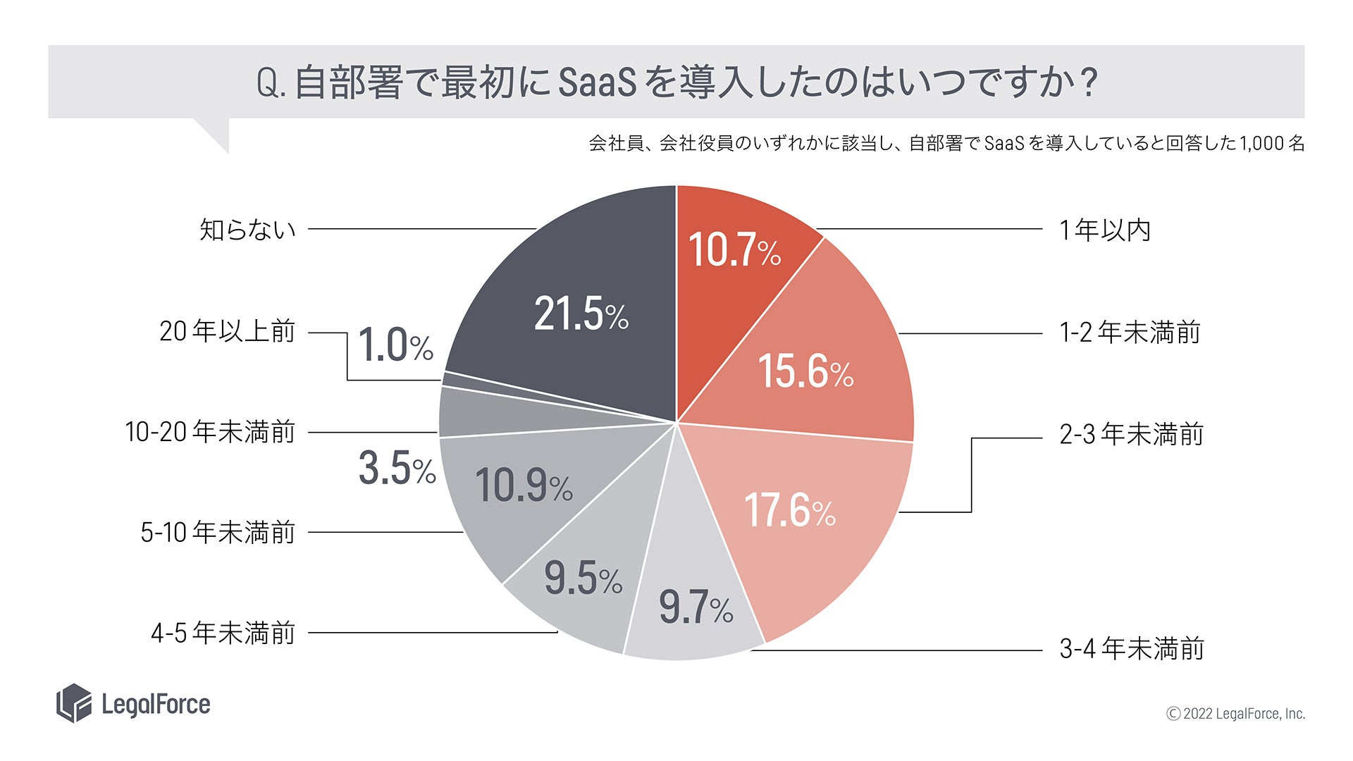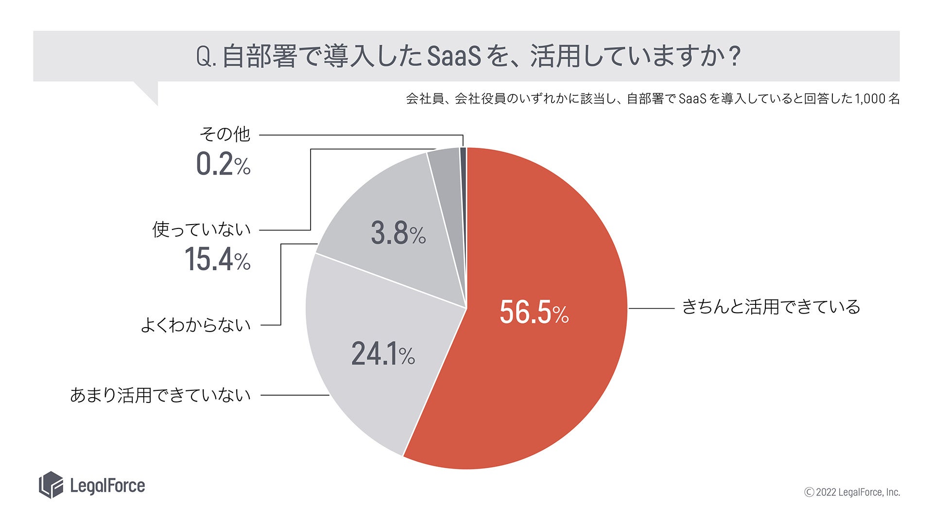 AI契約審査プラットフォーム「LegalForce」、AI契約管理システム「LegalForceキャビネ」を提供する株式会社LegalForce(本社:東京都江東区 代表取締役:角田望、以下LegalForce)は、自部署でSaaSを導入していると回答した1,000名を対象に、SaaSの活用に関する実態調査を実施いたしました。