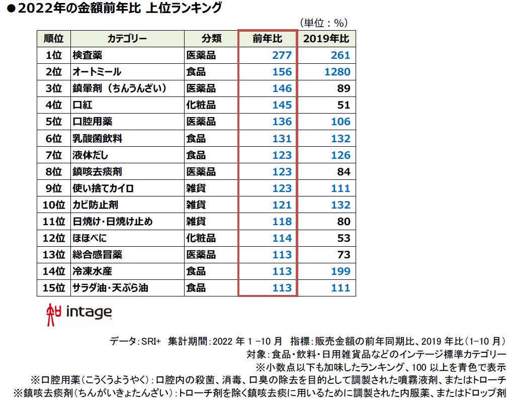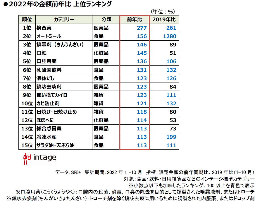 口紅などとともに外出のバロメーター的な存在なのが、今年3位で乗り物の酔い止めなどが入る鎮暈剤(ちんうんざい)です。2021年に比べ146%と大幅に販売金額を伸ばし、生活者の意識の変化に加え、自治体などの旅行支援策もあり、旅行などが活況だったことが分かります。9位・使い捨てカイロ(123%)、11位の日焼け・日焼け止め(118%)なども外出増で増える商品で、withコロナへのシフトがうかがえました。