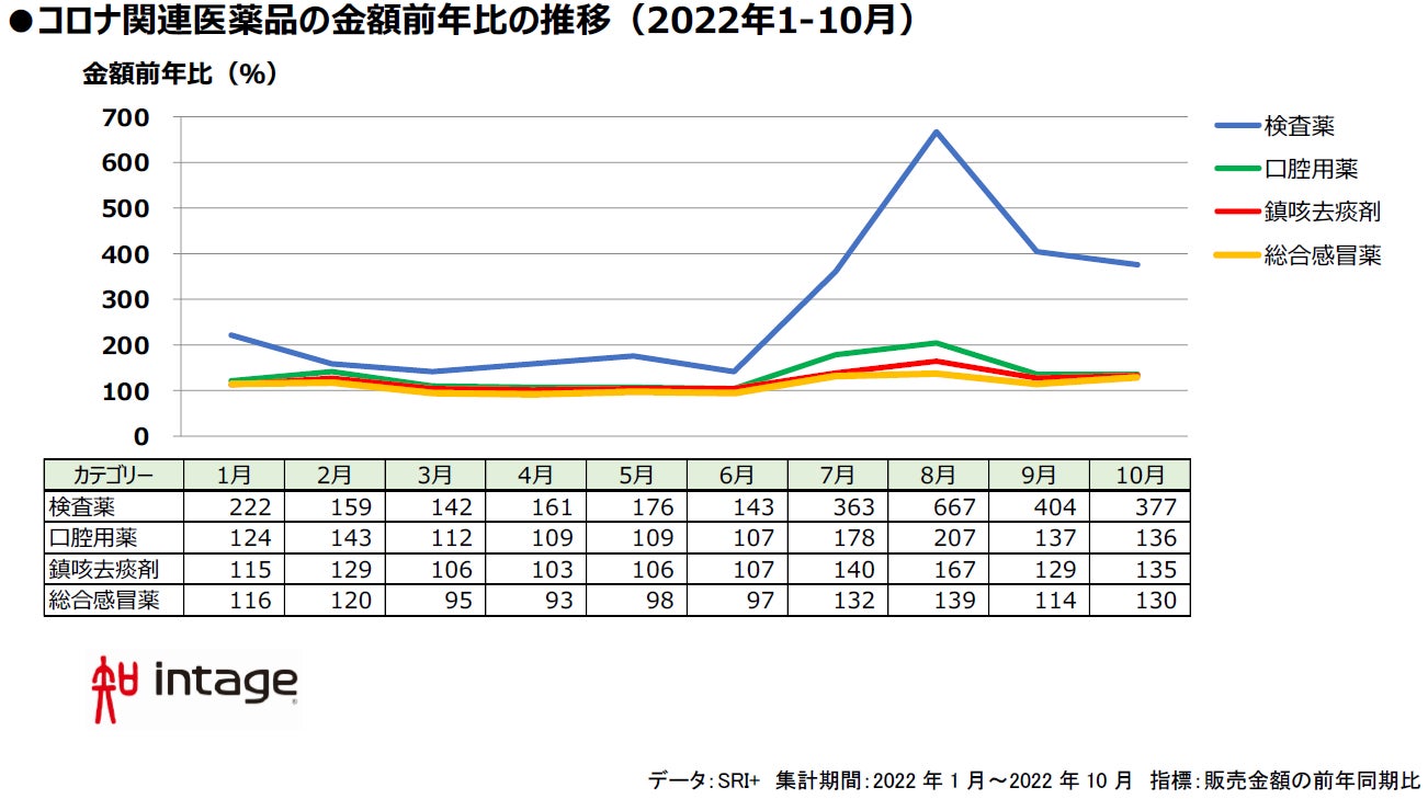 新型コロナ3年目、1位となったのは検査薬でした。昨年同時期比で277%と大幅に数字を伸ばしましたが、その主因となったのがコロナ用の抗原検査キット※1。第7波の拡大が急速に進んだ夏頃から売り上げが伸び(図表2)、7月に363%になると8月には667%にまで続伸。9月、10月も前年比4倍程度となっています。感染者数と連動する動きを見せていただけに、今後第8波が拡大するようだと、さらなる需要増もありそうです。