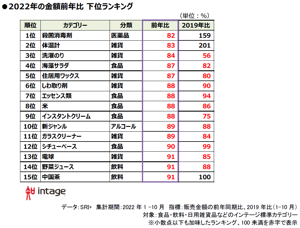 最後に今年販売苦戦したランキングを見てみましょう(図表4)。1位は殺菌消毒剤(82%)。コロナ禍では建物などに入るたびに置いてあった手指消毒剤を含むカテゴリーで、以前より利用頻度や持ち運んでいる人が少なくなっている可能性があります。2位・体温計(83%)は昨年よりは減っていますがコロナ前に比べると201%と大きく伸びています。またダウントレンドが続く、3位・洗濯のり(84%)、4位・海藻サラダ(87%)、8位・米(88%)、なども上位に入りました。6位・しわ取り剤(88%)は衣服用のもので、ウイルス除去などを訴求したものが昨年は売れましたが、その反動もあり今年はふるいませんでした。ステイホーム系では5位・住居用ワックス(87%)、7位・エッセンス類(88%)、11位・ガラスクリーナー(89%)なども売り上げを落としています。