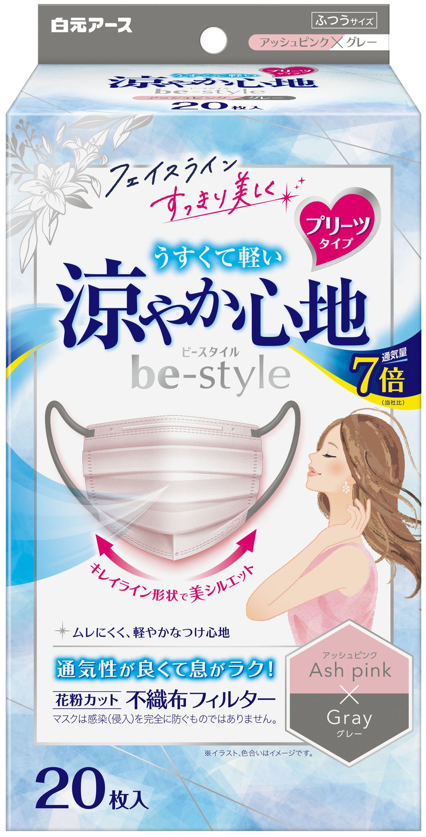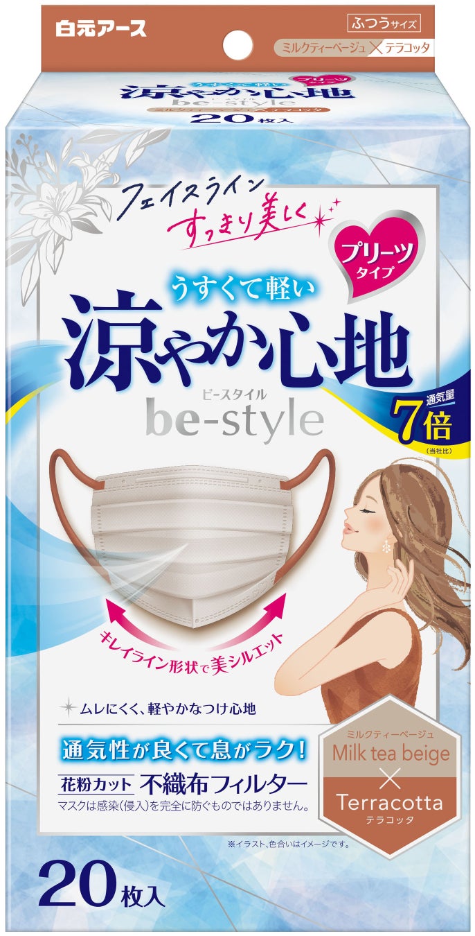 「ビースタイル プリーツタイプ 涼やか心地」は、ムレにくく、軽やかなつけ心地のエアスルー製法の口もと素材を採用し、通気量が従来の不織布マスクの7倍※2 のマスクです。2018年の発売以降、着用時のムレが気になる季節に、爽やかで呼吸が楽になるマスクとして好評をいただいています。また、形にもこだわったキレイライン形状で、美しいシルエットを叶えるマスクです。アゴ部分の縦プリーツと、両サイドの引き上げタックによりフェイスラインがきれいに見えます。加えて、プリーツトップの位置を上げることにより、プリーツが上から広がり横顔もすっきりきれいです。