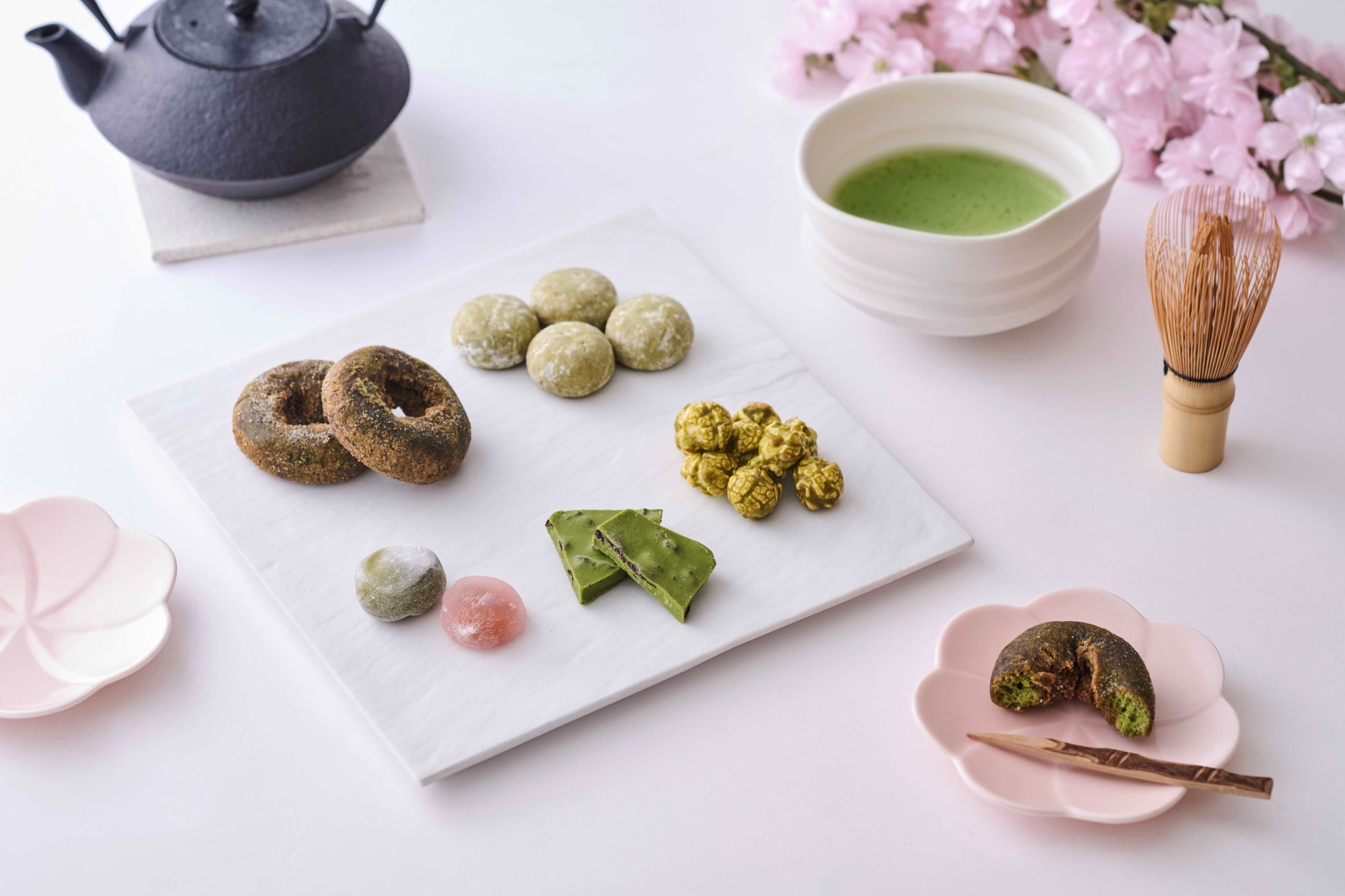 チョコレートやポップコーン、おもちなど和洋を問わず様々な種類のお菓子と抹茶を組み合わせました。