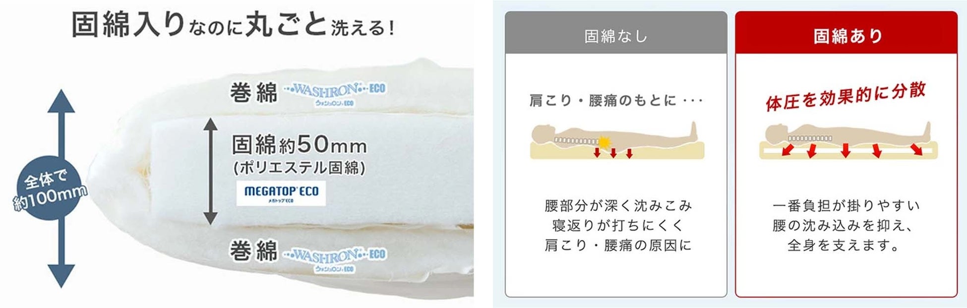 こちらの敷布団の固綿は特殊加工を施し、帝人メガトップ®ECOを使用することでコインランドリーでの洗濯が可能となりました。この素材はYQ断面中空ポリエステル短繊維素材で、軽くて硬いのが特徴です。固綿として沈みこみを防ぐことで正しい寝姿勢をサポートし、さらに特殊加工によって「撥水性」が向上しているため、乾きやすく洗濯しても傷みにくくなっています。