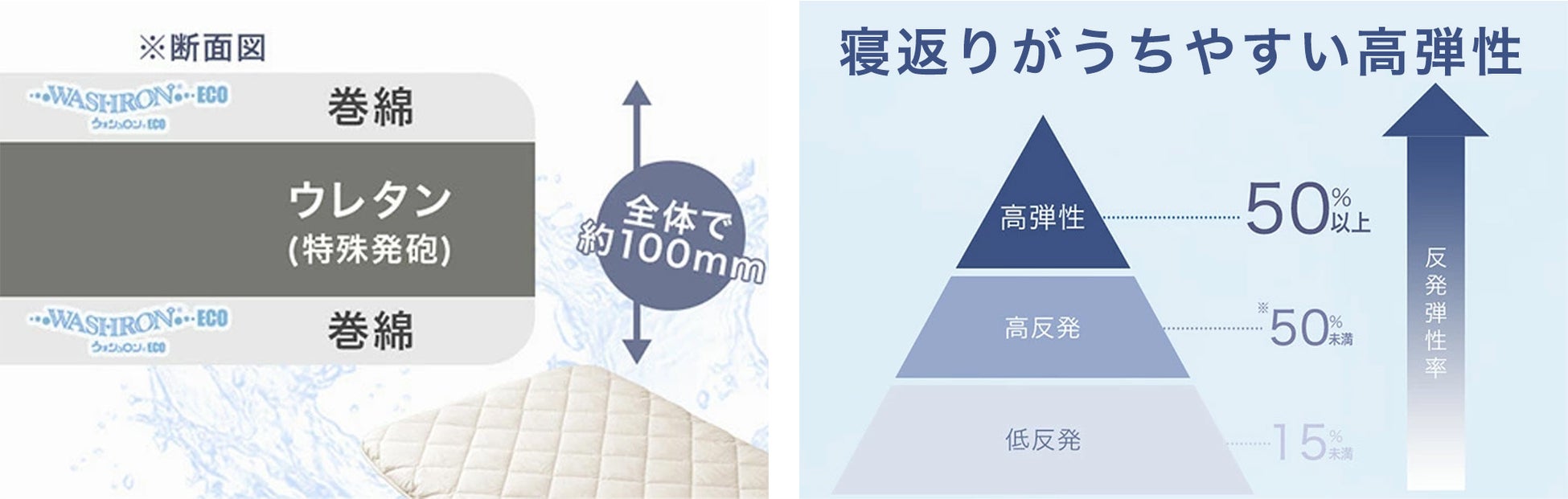 しかし“高弾性特殊発泡ウレタン”はその膜を大幅に取り除き、通気性を向上させたことで洗濯することが可能となり、このウレタンを固綿の代わりに中芯として使用しています。このウレタンは反発弾性率52%の高反発を超える「高弾性」のため、その強い反発力が寝返りをサポートし快適な寝心地を実現しています。
