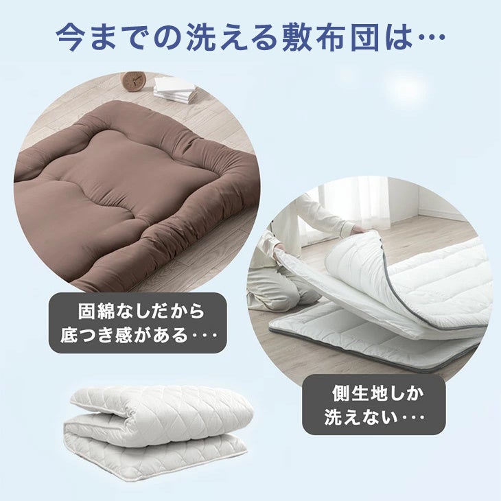 また、「洗える敷布団」として販売されている製品の中には固綿が入っておらず底つき感を感じやすい製品や、分割して側生地のみ洗える製品もあります。