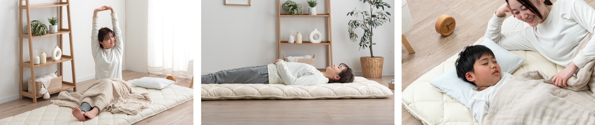 そこでタンスのゲンは、固綿入りの底つき感のない快適な寝心地のまま、分割などの手間が必要なく丸ごと洗える敷布団を開発しました。これによりお子様やペットとも安心して清潔に、そして快適にお休みいただくことができます。