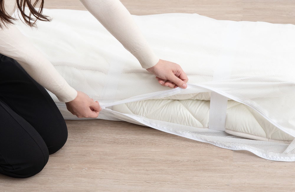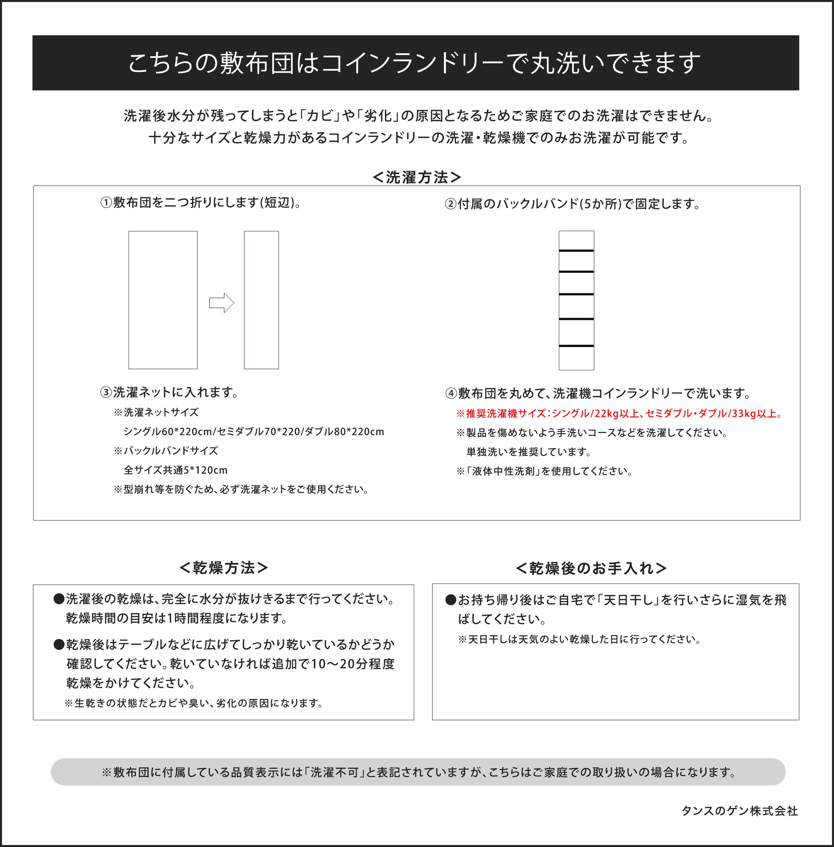 敷布団の洗濯が初めての方や不安がある方でも安心して洗っていただけるよう、洗濯の手引書と洗濯専用ネット・バンドを付属しています。洗濯方法や乾燥方法、ご自宅に持ち帰ってからのお手入れ方法なども書かれており、また洗濯用のネットとバンドを別途用意する必要もございません。