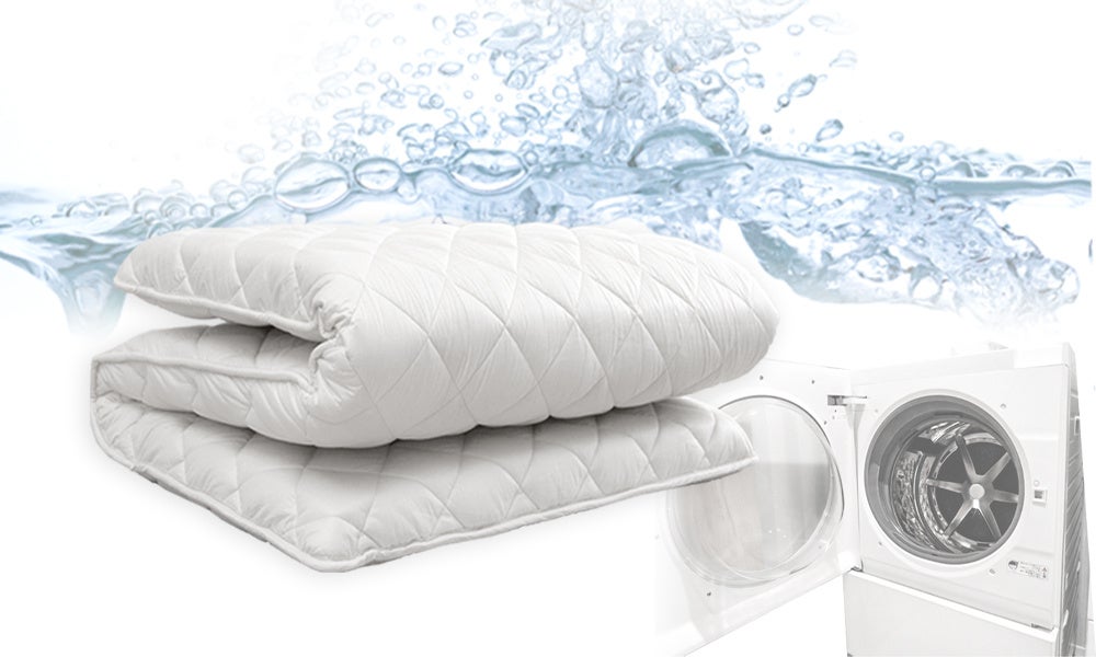 2種類のコインランドリーで洗える3層敷布団はどちらも巻き綿に帝人ウォシュロン®ECOを使用しています。この“ウォシュロン”は洗濯を繰り返しても、へたることが極めて少なく、また洗った後も軽くてふっくらした感触が特徴の洗える中綿素材です。そのため、繰り返し洗ってもふんわりとした肌触りが保たれ、速乾性にも優れているためすぐに乾きやすいのも特徴です。