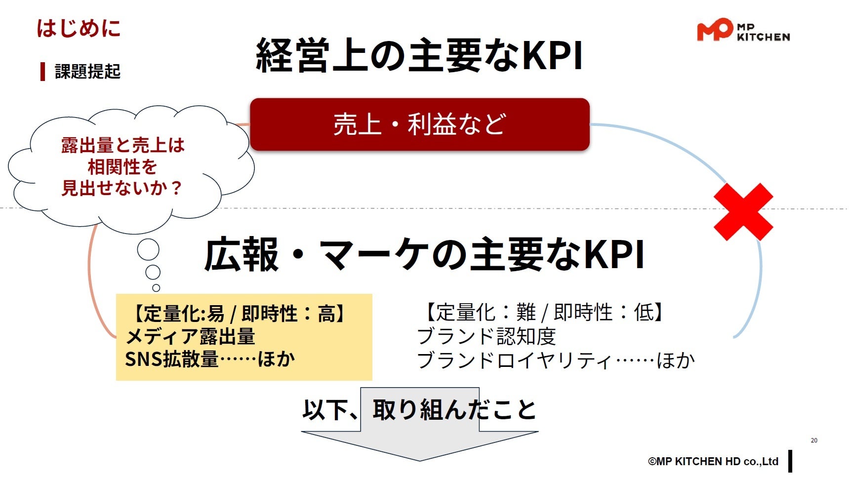 ①:当社では、「取り組み・成果が経営層や営業部に伝わらない」という広報・マーケティングの”あるある”な課題に対し、”双方のKPIどうしの相関性”見出すことにより解決を図りました。