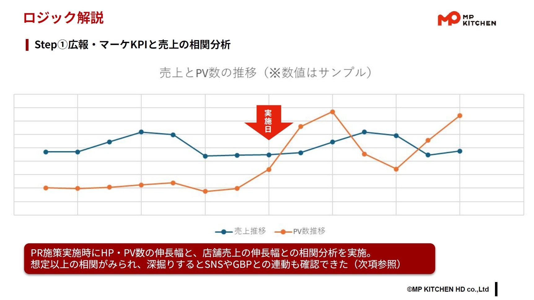 ②:まず、最も解り易い指標としてHPのPV数と売上の相関分析を行ったところ、PR施策の成功によりPVが大きく伸長した時期に、売上も一定の割合で比例するように伸長していることが確認できました。さらに深掘りすると、公式SNSのインプレッションや外部投稿者によるバズ、Googleマップの表示回数といったチャネル毎の指標とも相関関係がみられました。
