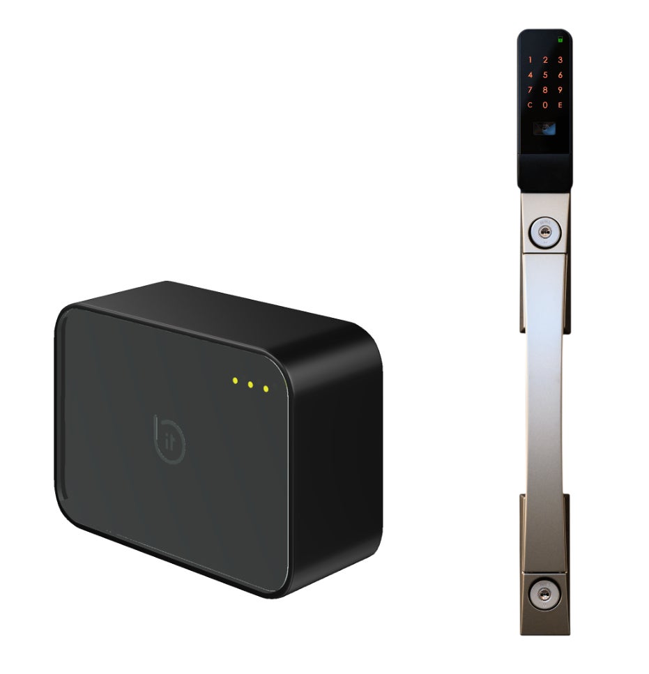 写真左:エントランスドアに設置した電子制御ドア向けスマートロック「bitlock GATE」