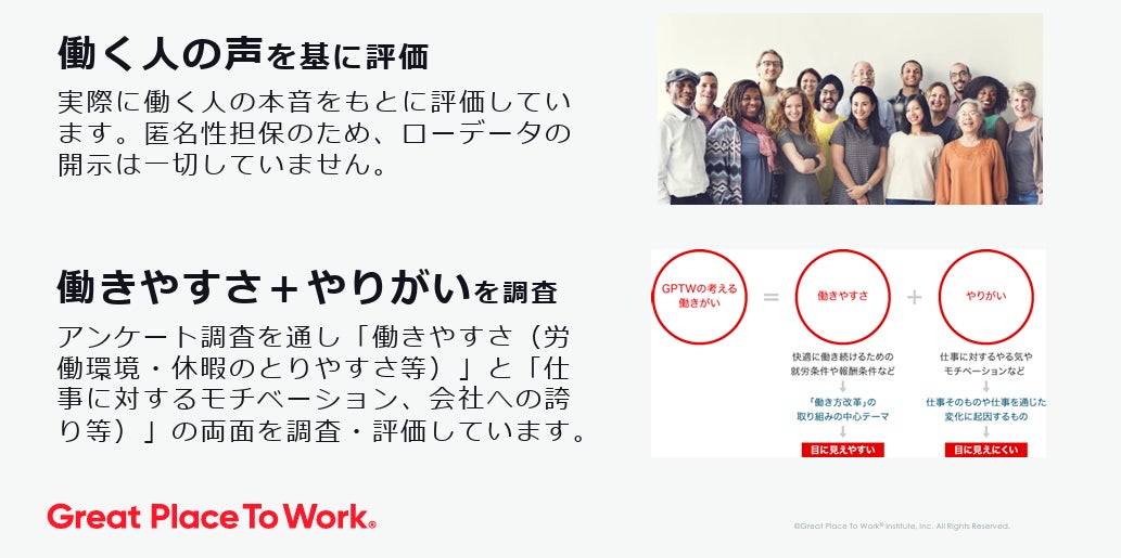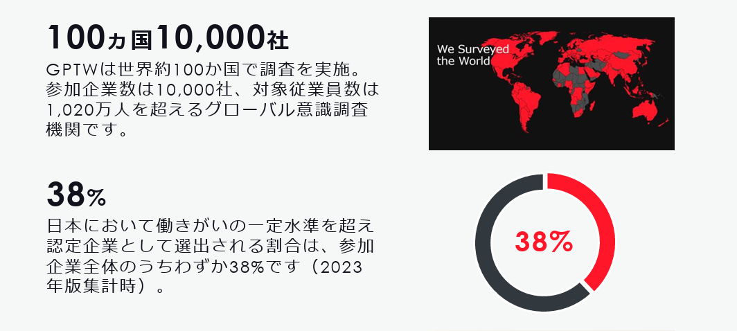 Great Place to Work® Institute は、「働きがいのある会社(Great Place to Work®)」に関する調査・評価・支援を行う専門機関です。「働きがいのある会社」を世界共通の基準で調査し、各国の有力メディアで「働きがいのある会社ランキング」を発表しています。調査には、毎年約60カ国で7,000社、500万人を超える従業員が参加しており、世界最大規模の従業員意識調査となっています。