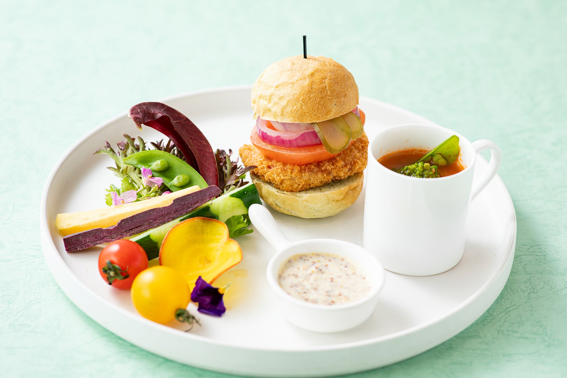 「サザンタワーダイニング」(20階)、3月からの春メニューでは通常のメニューラインアップに、食やライフスタイルの多様化により需要が拡大しているヴィーガン対応のメニューが加わります。今までもランチやディナーメニューで提供していた東京の自然豊かな環境で育った新鮮な野菜のグリルやごろごろ野菜のスープなどに加え、大豆ミートを使ったスライダーバーガー(ミニバーガー)プレートや季節の味わいジェラートを新しくラインアップします。