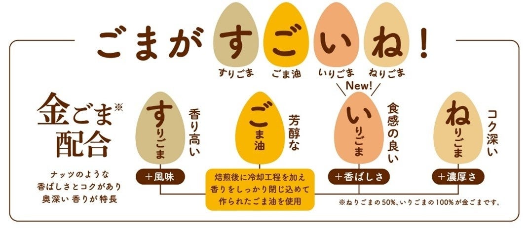 新たに「いりごま」を加え、食感のアクセントと香りをプラス。さらに金ごまを増やし(※)、
