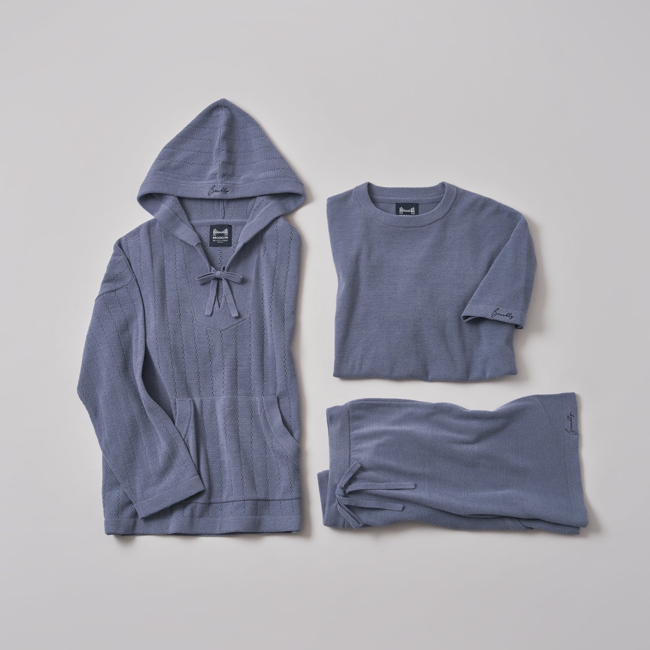 ルームウェアはもちろん、ワンマイルウェアとしても活躍するデザインのフーディーはオリジナルのバハフーディーに近い雰囲気を目指した編み柄が特徴。胸元のカッティングとややゆとりのあるサイズ感で通気性もよく、気温の高いこれからの季節でも快適に着用いただけます。