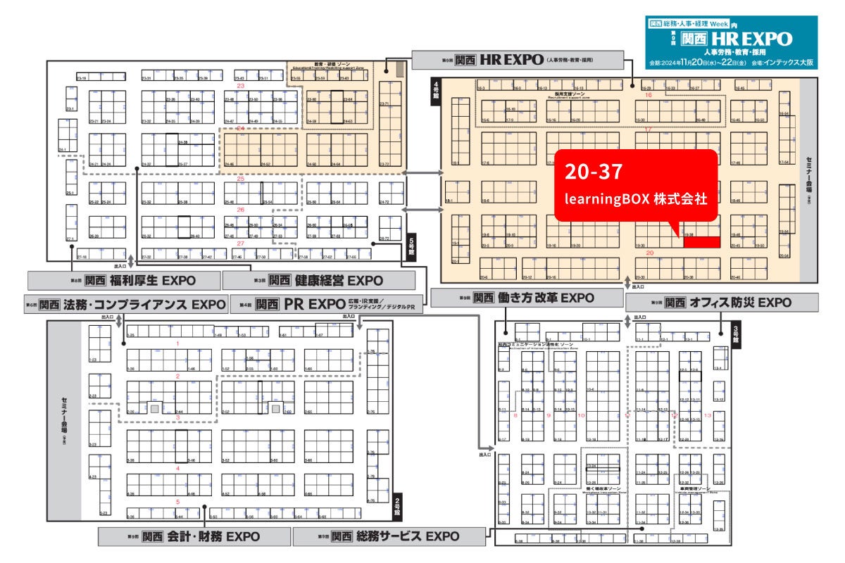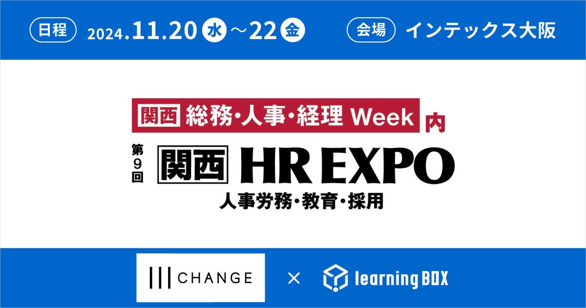 eラーニングシステムの開発・運営を行うlearningBOX(ラーニングボックス)株式会社(本社:兵庫県たつの市、代表取締役:西村 洋一郎)は、2024年11月20日(水)~22日(金)にインテックス大阪で開催される「第9回【関西】総務・人事・経理 Week HR EXPO(人事労務・教育・採用)」に、株式会社チェンジと共同出展いたします。人事DX・採用/教育・人的資本経営推進など関西最大の人事部門・経営者向け展示会で、研修事務局の業務に精通したチェンジと多機能のeラーニングシステム「learningBOX」による研修業務DXについて、ご紹介します。