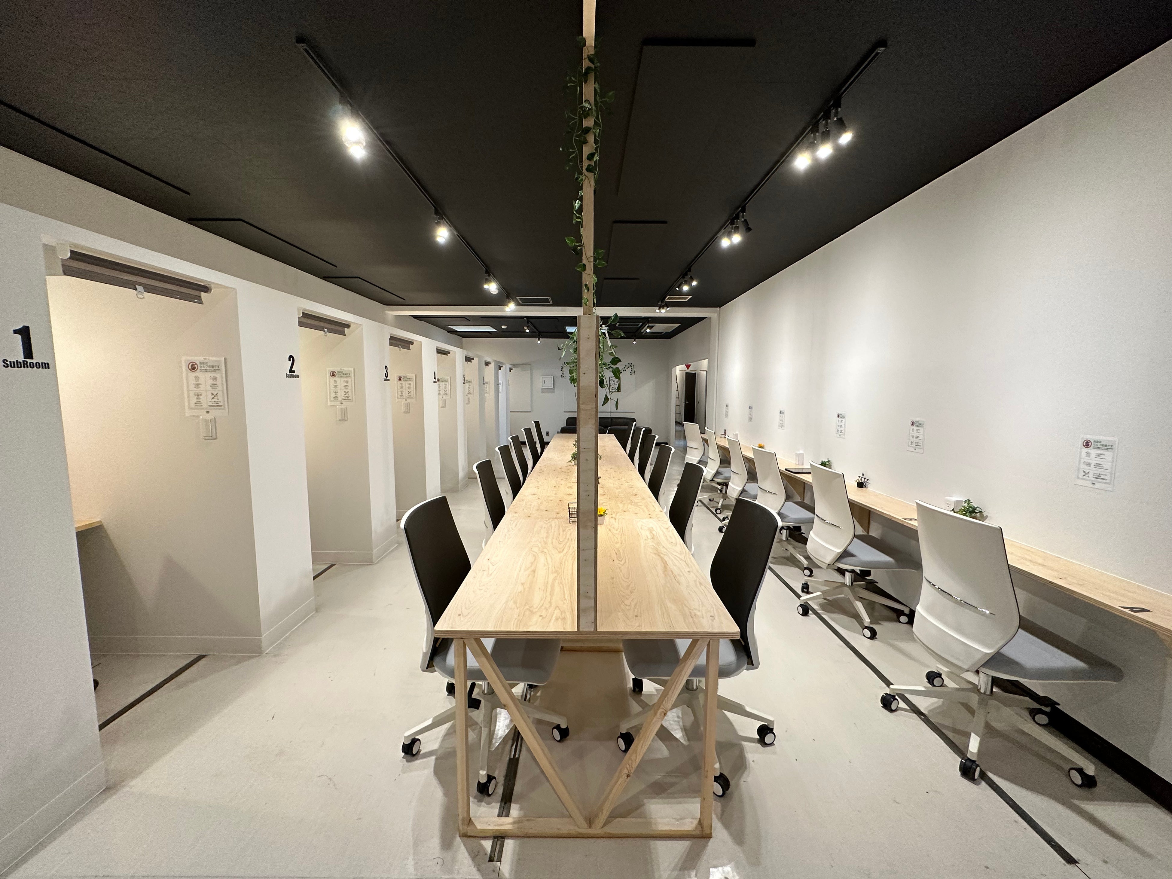 白と黒を基調としたシンプルな内装の中に、木の温かみを感じられる落ち着きあるデザイン。コワーキングエリアは、気分や目的に応じて半個室とカウンター席をお選びいただけます。