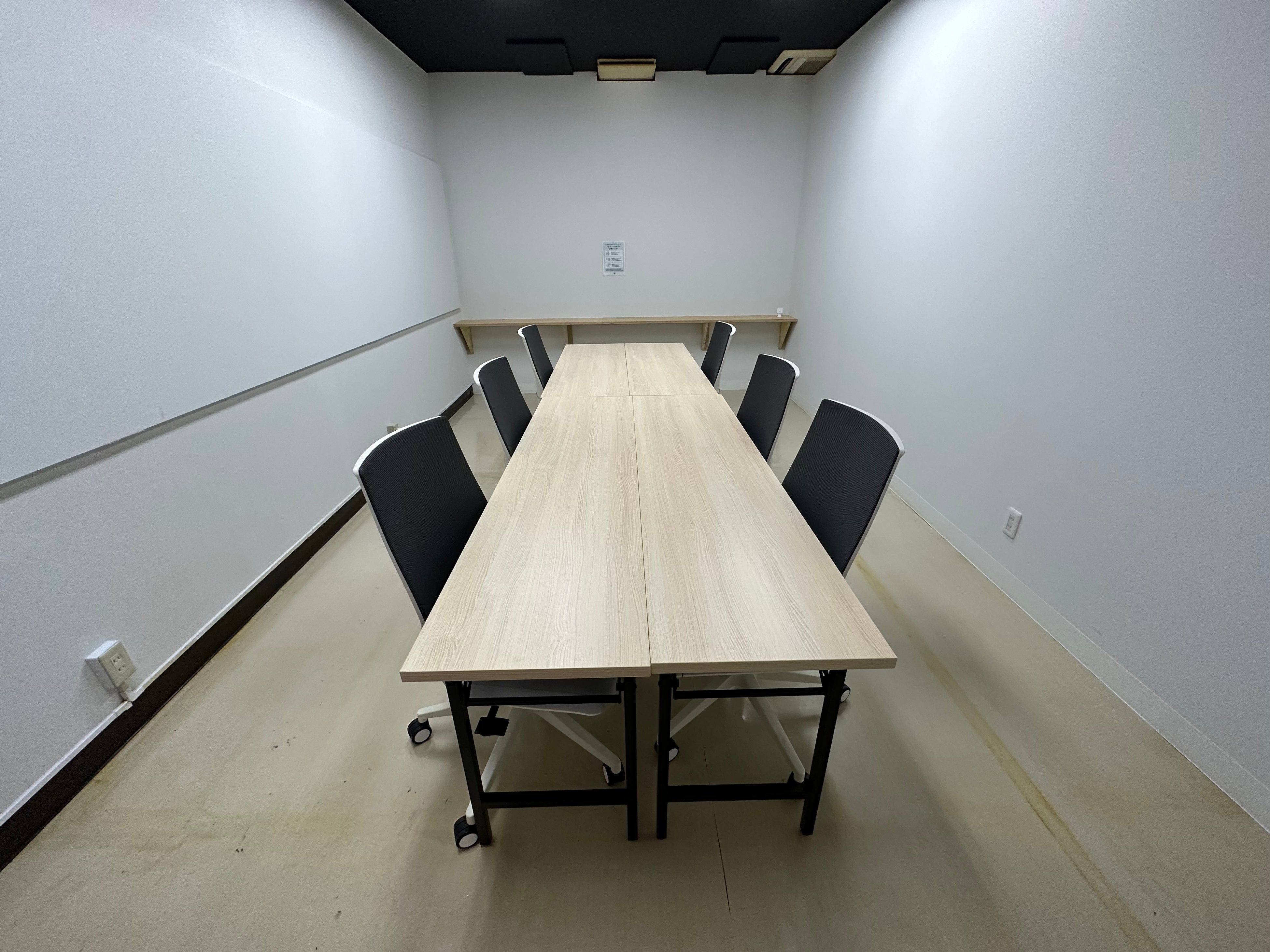 軽防音ブースは2名〜最大8名まで利用できる完全個室を6室ご用意。会議室やシェアオフィスなど、目的に応じてご利用いただけます。
