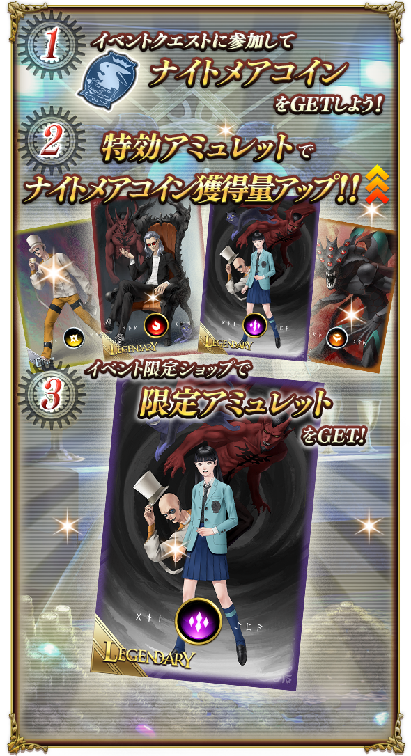 今回の金子一馬 氏とのコラボNFTを記念して、ゲーム内でコラボイベント「Tea Party of Nightmares」を開催いたします。イベントの報酬で、LEGENDARYであるアリスのアミュレットが獲得できるほか、コラボで獲得できるアミュレットをデッキに組むとイベント報酬がアップいたします。