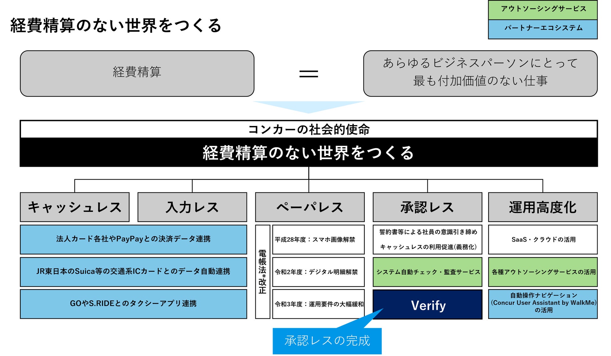 コンカーは「経費精算のない世界をつくる」をテーマに、経費精算業務を高度化する、5つのレス(キャッシュレス、入力レス、ペーパレス、承認レス、運用レス)の実現に向け、サービスの拡充、パートナーとの連携をはじめ、様々な取り組みを続けてきました。5つのレスのなかで、唯一未完成であった「承認レス」が、2025年春にリリース予定のAI不正検知サービス 「Verify」によって実現されます。