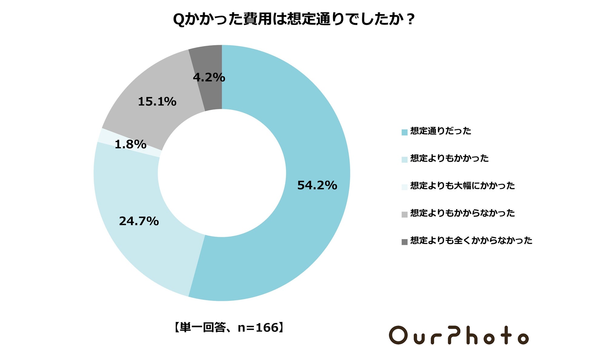 かかった費用に対して想定通りだったか質問したところ、「想定通りだった(54.2%)」が最も多く、次いで「想定よりもかかった(24.7%)」、「想定よりもかからなかった(15.1%)」という結果となり、半数以上の人が予算内で実施していました。一方で、「想定よりもかかった」「想定より大幅にかかった」と答えた人(計26.5%)が、「想定よりもかからなかった」「想定よりも大幅にかからなった」と答えた人(計19.3%)を上回りました。
