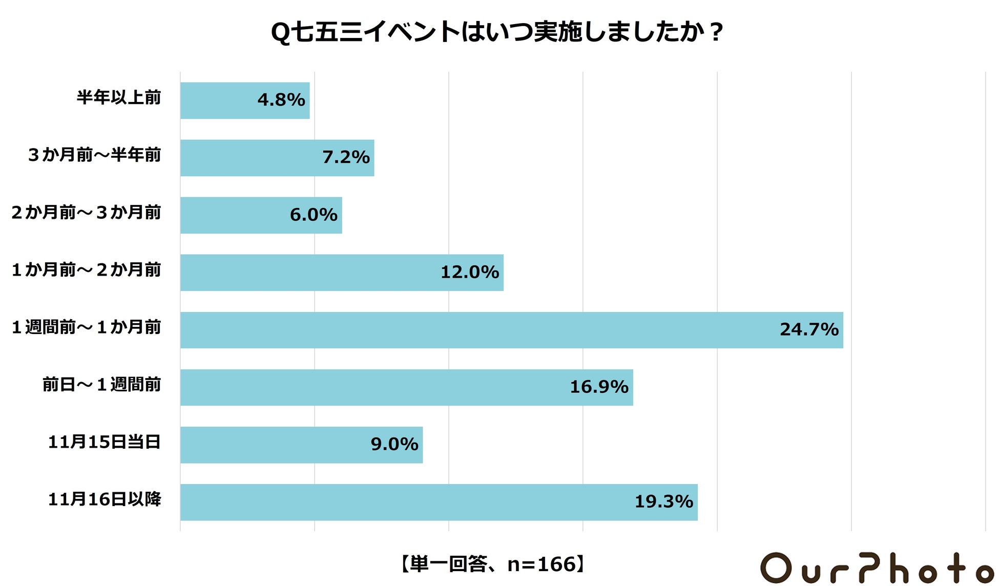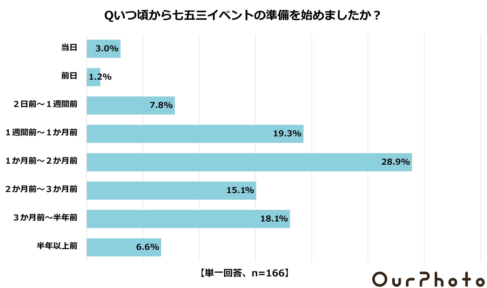 七五三イベントの準備を始めた時期について聞いたところ、最も多かったのが「1か月前~2か月前(28.9%)」、次いで「1週間前~1か月前(19.3%)」、「3か月前~半年前(18.1%)」、「2か月前~3か月前(15.1%)」という結果となり、約8割の人が早めに準備を始めていることが分かりました。