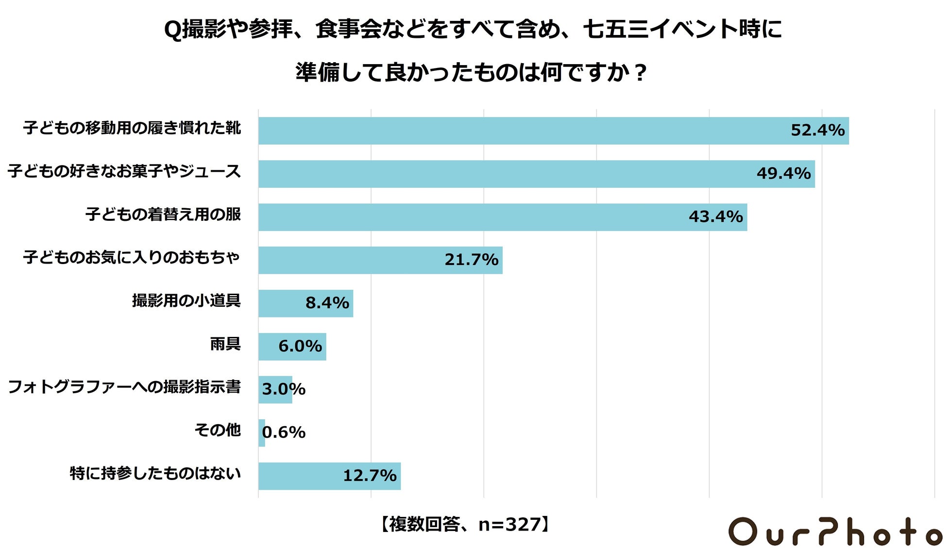 七五三イベント時に準備して良かったものについて聞いたところ、1位「子どもの移動用の履き慣れた靴」、2位「子どもの好きなお菓子やジュース」、3位「子どもの着替え用の服」という結果となりました。