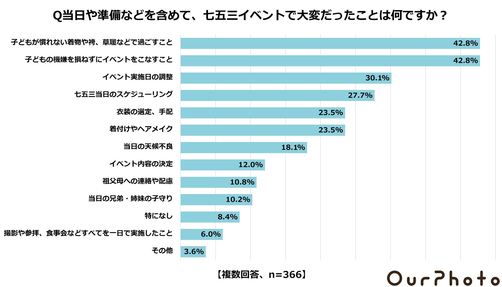 当日や準備などを含めて、七五三イベントで大変だったことについて聞いたところ、「子どもの機嫌を損ねずにイベントをこなすこと」と「子どもが慣れない着物や袴、草履などで過ごすこと」が42.8%で同率1位となり、次いで3位が「イベント実施日の調整(30.1%)」、4位が「七五三当日のスケジューリング(27.7%)」とスケジュール調整が大変だったということが分かりました。