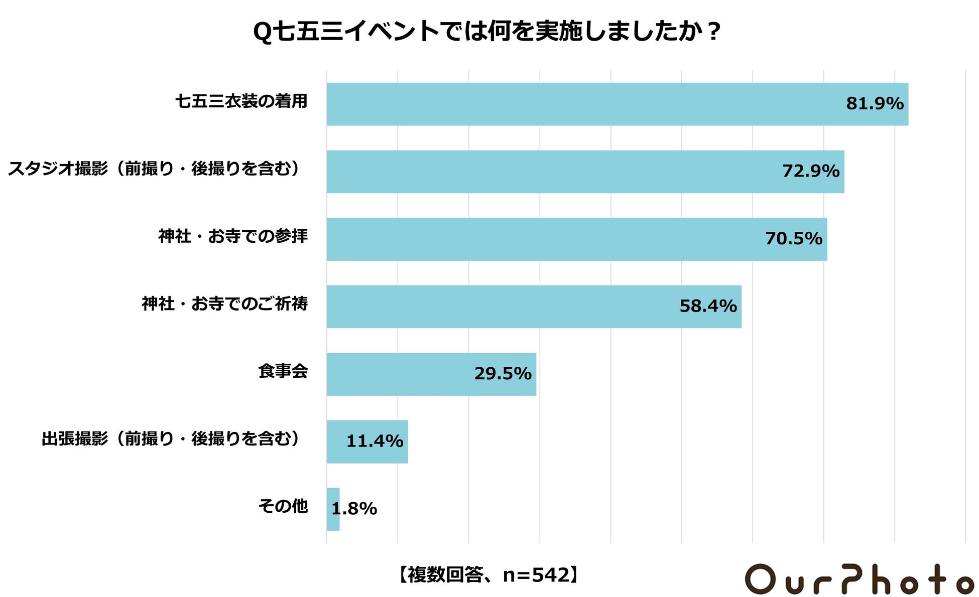 七五三イベントで実施したイベントについて聞いたところ、「七五三衣装の着用(81.9%)」が最も多く、次いで「スタジオ撮影(前撮り・後撮りを含む)(72.9%)」、「神社・お寺での参拝(70.5%)」となり、上位3つを7割以上の人が実施している結果となりました。