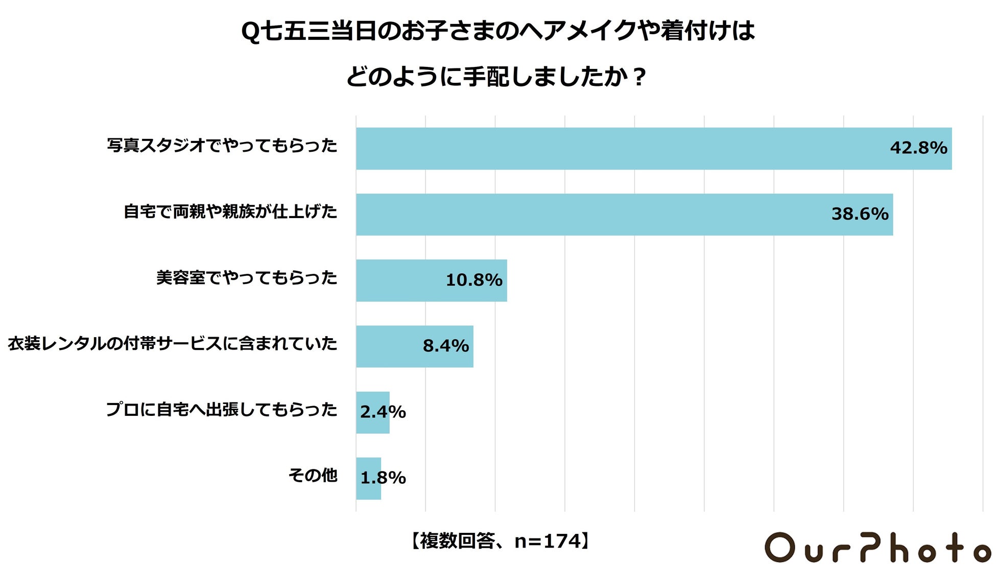 七五三当日のメイクや着付けの手配についての質問に対して、最も多かったのが「写真スタジオでやってもらった(42.8%)」、次いで「自宅で両親や親族が仕上げた(38.6%)」、「美容室でやってもらった(10.8%)」という結果となりました。