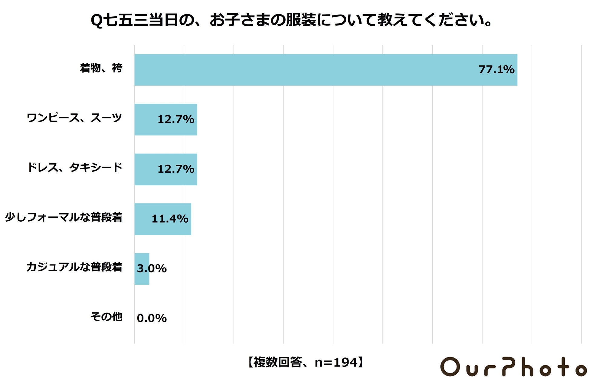子どもの服装について聞いたところ、「着物、袴(77.1%)」が最も多く、次いで「ワンピース、スーツ」と「ドレス、タキシード」が12.7%で同率2位となった。七五三のイベントに参加する子どもの服装として、伝統的な着物や袴が依然として圧倒的に人気であることが分かります。