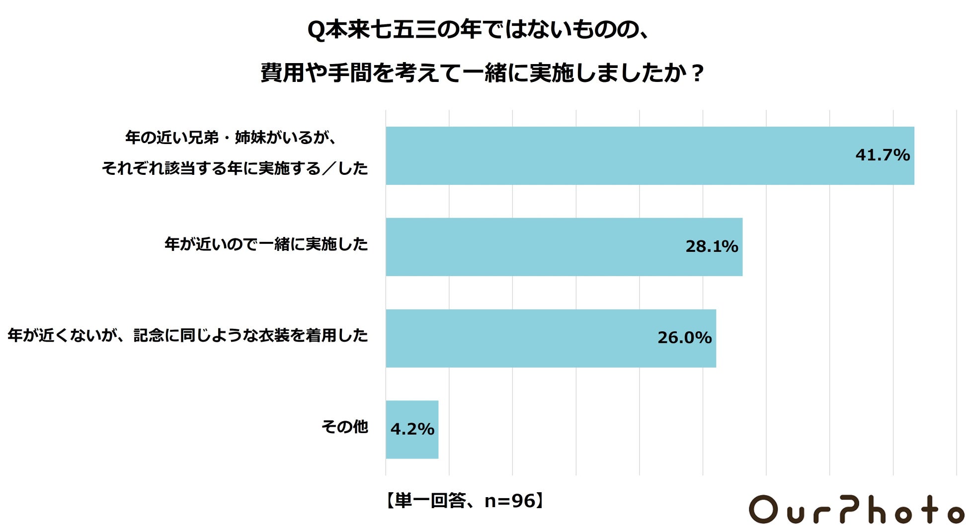 兄弟・姉妹がいる方に対し、本来七五三の年ではないものの、費用や手間を考えて一緒に実施したか聞いたところ、「年の近い兄弟・姉妹がいるが、それぞれ該当する年に実施する/した」が41.7%と、年齢が近い兄弟姉妹がいる場合でも、それぞれが該当の年齢に合わせて七五三を祝うこと傾向があることが分かりました。「年が近いので一緒に実施した」が28.1%、「年が近くないが、記念に同じような衣装を着用した」が26.0%という結果となりました。
