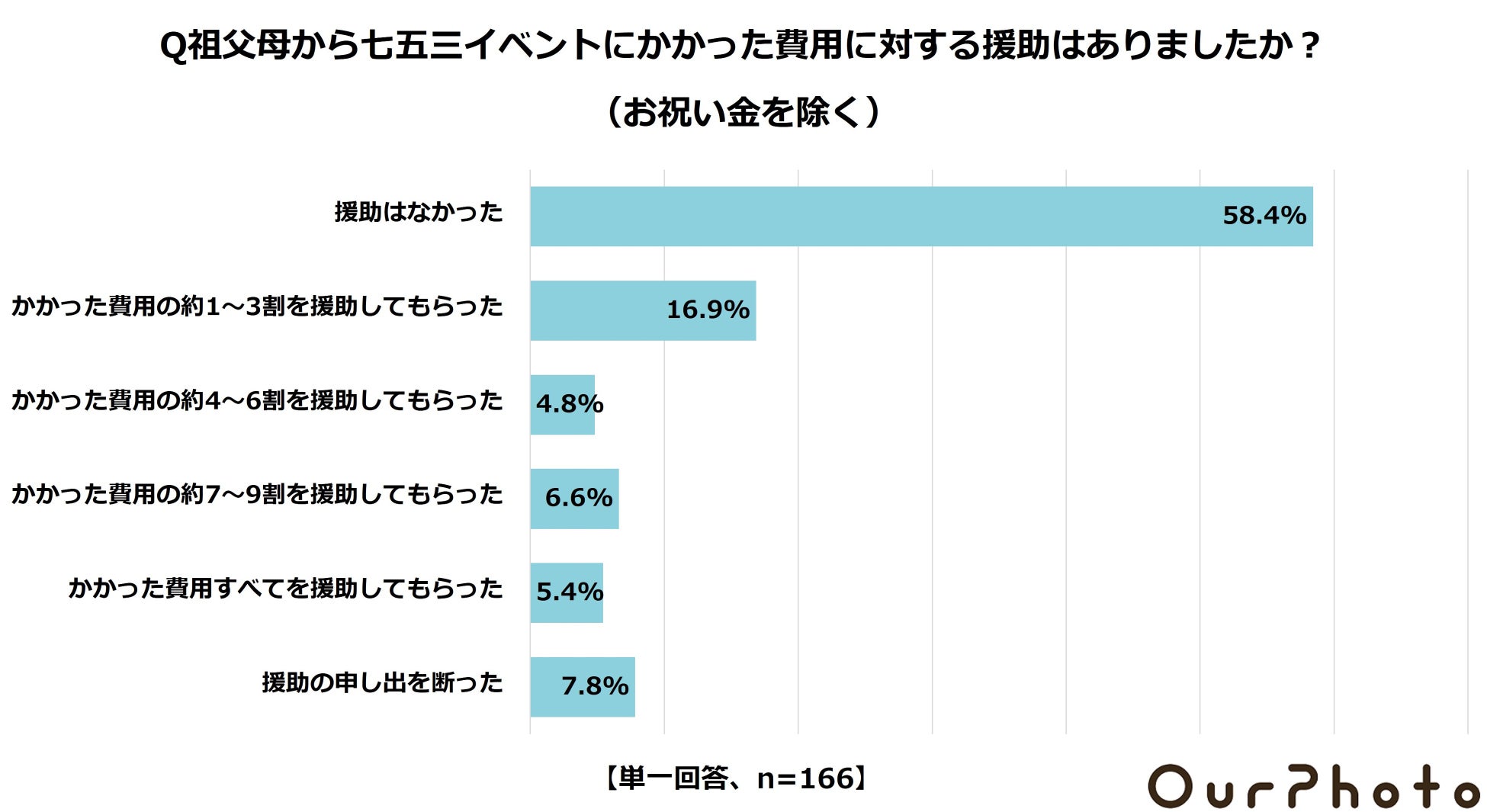 祖父母から費用に対する援助があったかという質問に対し、半数以上が「援助はなかった(58.4%)」と回答し、多くの方はお祝い金以外で祖父母から費用の援助を受けていないことがわかりました。次いで「かかった費用の約1~3割を援助してもらった(16.9%)」、「援助の申し出を断った(7.8%)」という結果となりました。