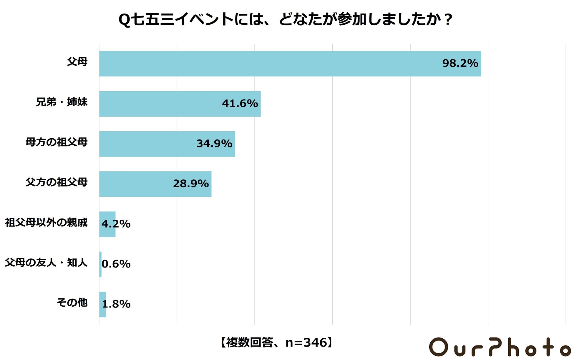 七五三イベントの参加者は「父母(98.2%)」に加え、兄弟が・姉妹がいる場合は「兄弟・姉妹(41.6%)」、次いで「母方の祖父母(34.9%)」、「父方の祖父母(28.9%)」となり、「父方の祖父母」より「母方の祖父母」の参加が多いという結果となりました。